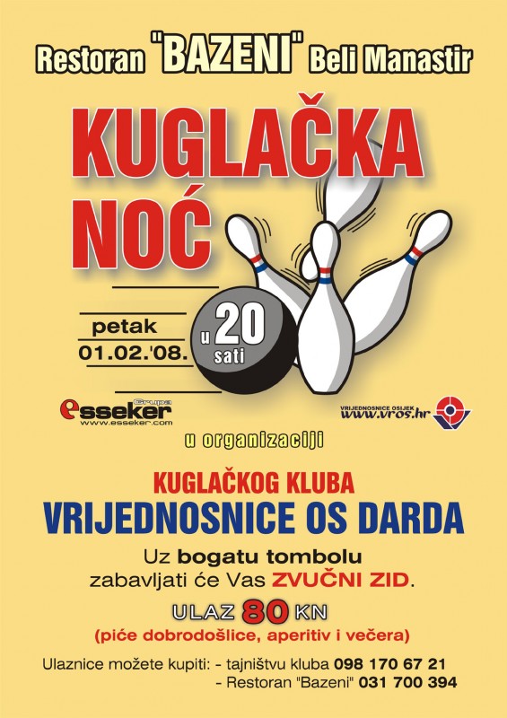 KK Vrijednosnice OS Darda organiziraju kuglaÄku zabavu, u petak, 1. veljaÄe 2008. godine, u Belom Manastiru.